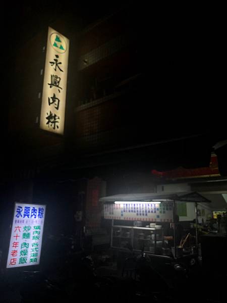 南京路上六十年老店「永興肉粽」,是一代、二代一同經營的小吃攤,在自宅裡面多了點傳統的感覺,有時會聽到些拌嘴,是因為對彼此的在乎,就像「永興肉粽」一樣「用心」,吃了20幾年味道不曾走味,希望在地的好味道能持續飄香店家整體算是攤車形式的店面型商家小吃攤 他們的乾麵(黃麵),是放在蒸籠裡面維持溫度,吃起來口感軟但不油 用餐環境:內用空間有六張桌子約24個座位餐點分為主食、 湯類及小菜類,外帶內用皆有 肉粽-粽葉香很醇厚,每粒米都飽滿的吸附這香氣,這樣的滋味一直是我最為懷念的 肉粽的內餡很單純,兩塊肥肉、一塊瘦肉、香菇與少許都炒料,送上來會先加少許油膏,喜歡東泉的加上去絕對加分 乾麵-先川燙後再以蒸籠加溫,吃起來沒有一層油味,搭配現煮的豆芽韭菜,最後淋上店家特製的醬汁,裡面吃起來有油蔥和炸肥油酥。厲害的點就是它很單純,卻吃到很深厚的味道建議可以點一個滷蛋把蛋黃扮進去一起吃,再加些東泉,是最完美的吃法爌肉飯-是滷汁飯與爌肉分開裝,他們家的三層肉魯的很香,也是我少數敢吃的肥肉,建議可以直接單點爌肉就好。 40元的湯品都滿推薦的,是店家放在另一個蒸爐里慢慢燉煮,呈盤時會在兌入高湯,湯頭十分濃厚,我們最常喝多是冬菜鴨 、苦瓜雞這兩個湯品